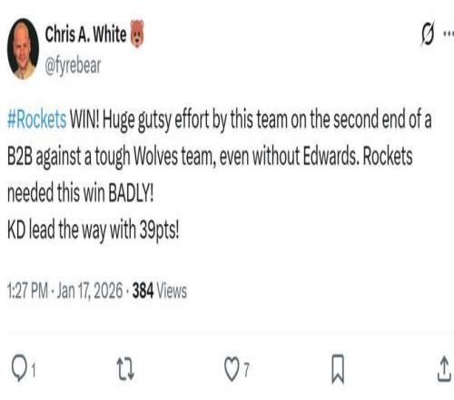 正如赛后火箭媒体人Chris A. White所说:“在背靠背第二战,火箭队击败了强敌森林狼,全队展现出巨大的勇气和拼劲,杜兰特轰下39分,拿下了一场急需的胜利。”