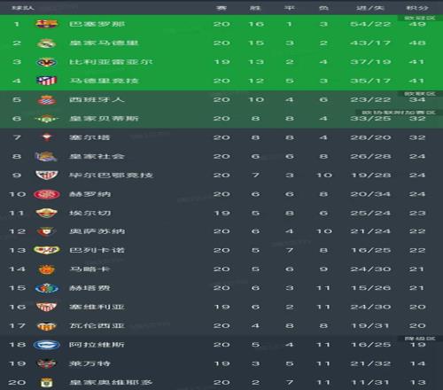 西甲第20轮结束了9场比赛,最新积分榜如下!